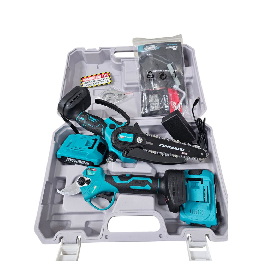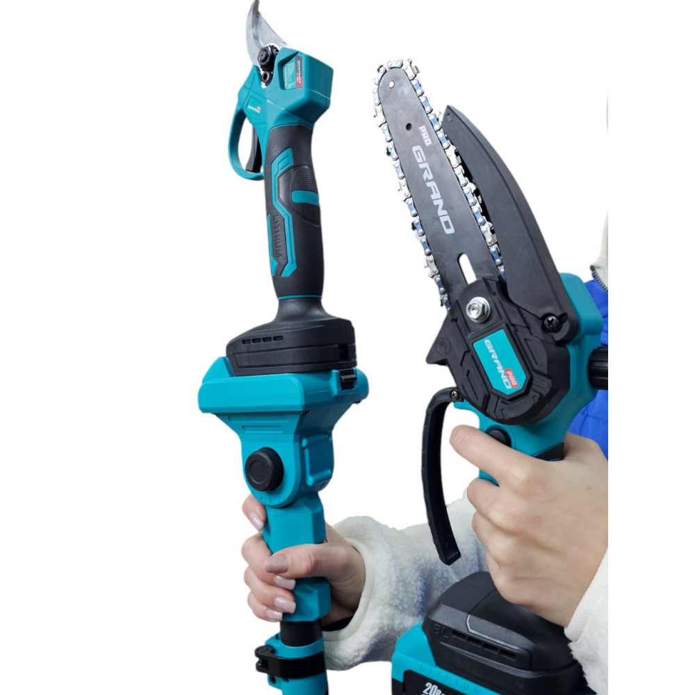 Набір акумуляторних інструментів Grand №2 G (СА-20BL + АПЦ-20/6"-2 BL) з телескопічною штангою-подовжувачем 1,3–2,5 м – це універсальне рішення для виконання садових робіт на будь-якій висоті. У комплект входять два потужні безщіткові інструменти: акумуляторна пилка та секатор, а також телескопічна штанга-подовжувач. Завдяки цій комбінації ви зможете швидко та безпечно обрізати гілки, формувати кущі, доглядати за деревами, виконувати заготівлю деревини невеликого діаметра та працювати навіть на значній висоті. Живлення від єдиної акумуляторної платформи 20V забезпечує зручність використання без підключення до мережі.
