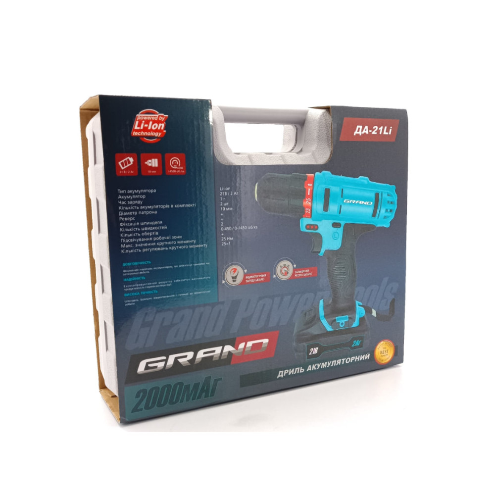 Grand ДА-21Li – надійний помічник для будь-яких завдань зі складання, монтажу або ремонту. Завдяки двом акумуляторам, швидкій зарядці, компактним габаритам та продуманим функціям, цей інструмент стане вдалим вибором для тих, хто цінує ефективність і зручність у роботі.