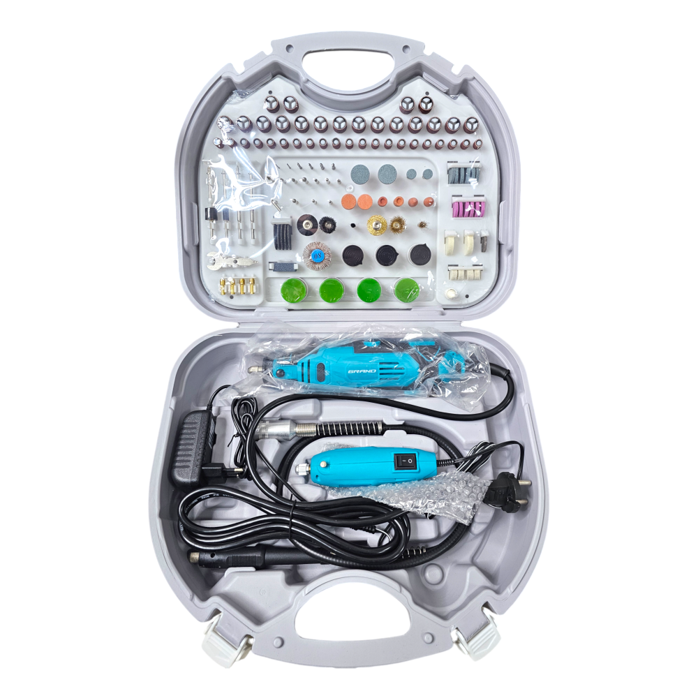 • Розширений комплект аксесуарів (252 шт.) – включає насадки для різання, шліфування, гравіювання, полірування та свердління;