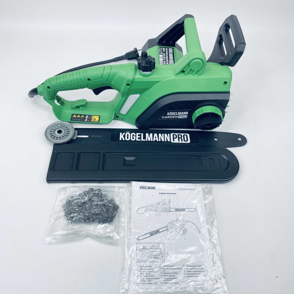 Пила ланцюгова електрична .У комплекті ключ для збірки піли.Це високоякісна , надійна та потужна пила,для професійного та домашнього використання, може зрізати гілки та дерева з діаметром до 45см. , має розповсюдженний тип ланцюга ,який можна купити окремо ( є в наявності), ми надаемо гарантію 12 місяців