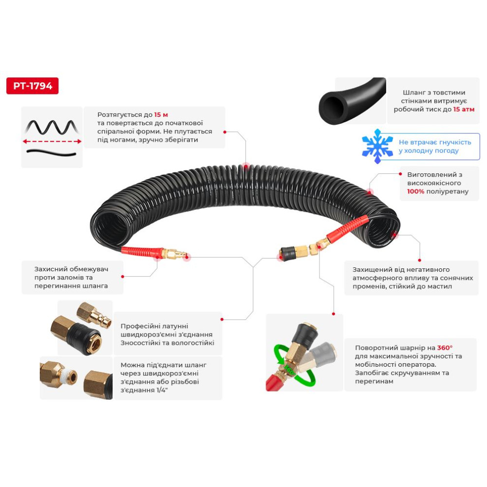 Завдяки спеціальним обмежувачам на кінцях шланга забезпечується цілісність виробу, він захищений від заломів та можливих пошкоджень. Оснащений латунними швидкороз'ємними з'єднаннями, які мають ряд переваг перед сталевими, вони більш довговічні, стійкіші до корозії, мають більший термін експлуатації тощо.