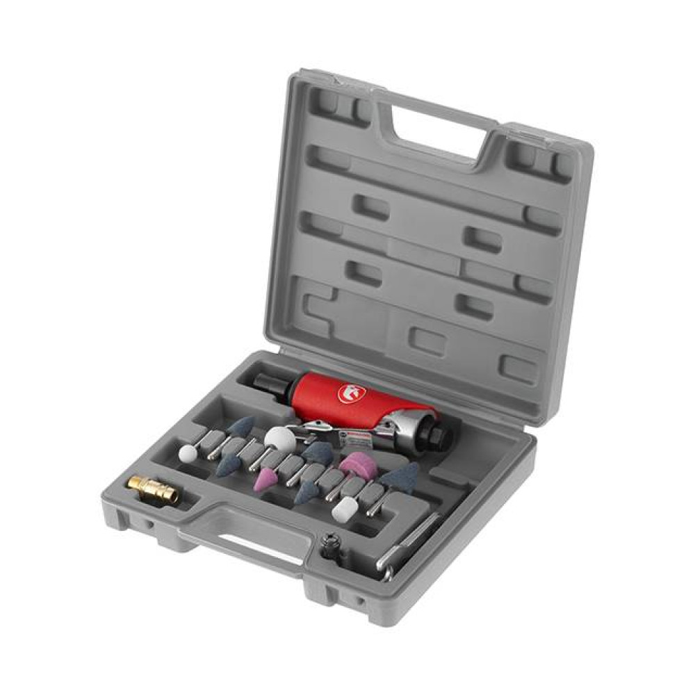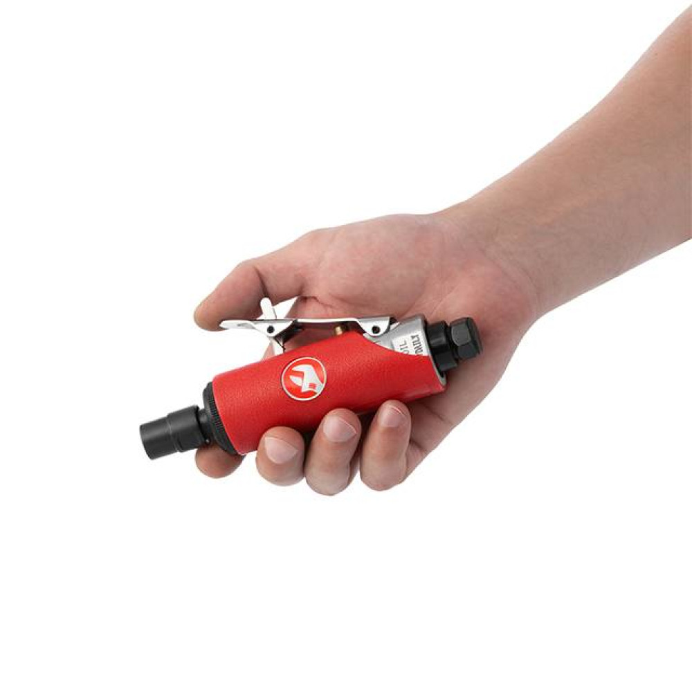 Пряма шліфувальна машина виконає будь-яке завдання, пов'язане з точною обробкою, достатньо підібрати необхідну насадку. Встановлений простий та надійний цанговий затискач 6 мм. Завдяки високій швидкості ефективно справляється зі своєю роботою, не вимоглива до джерела повітря, витрата становить 115 л/хв.