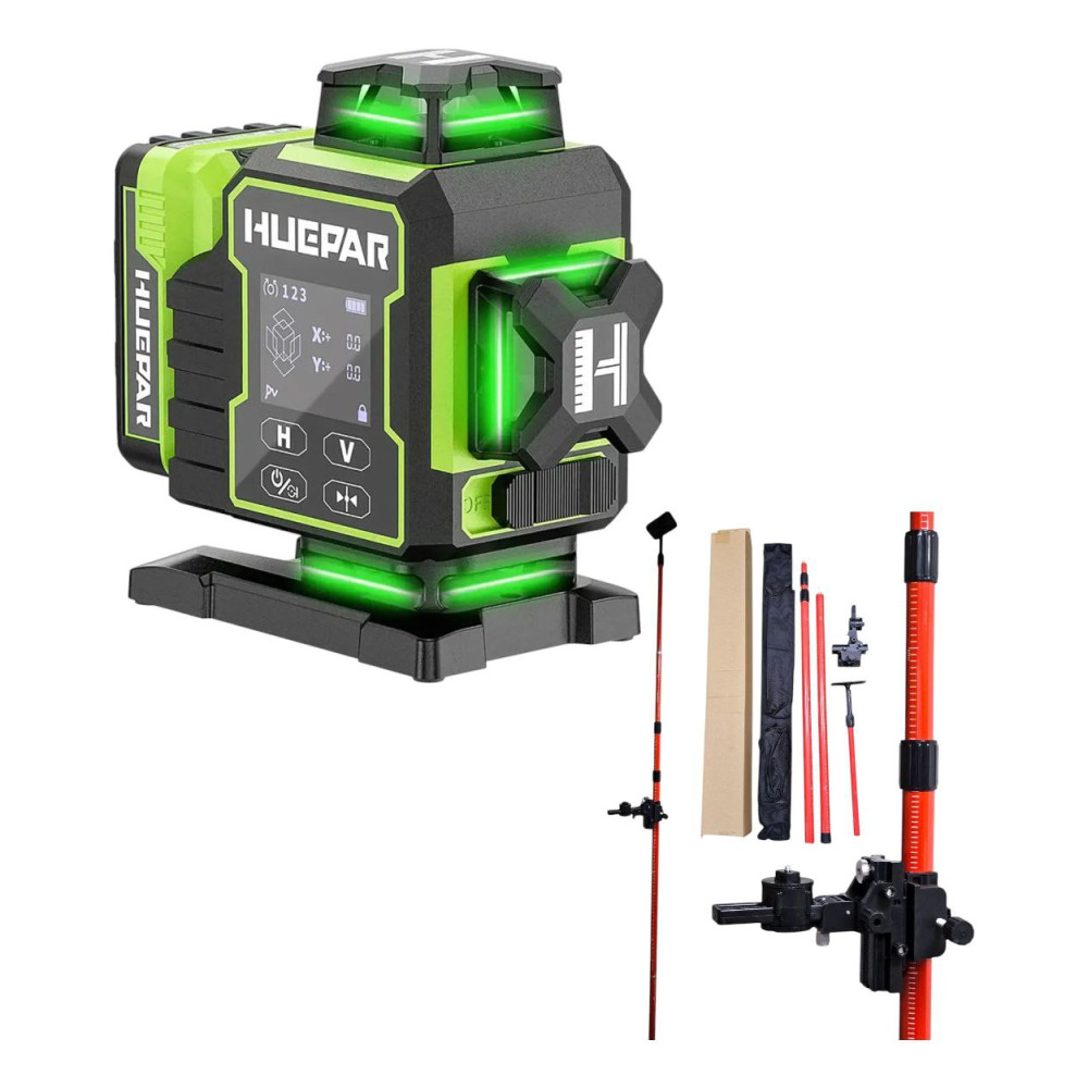 Лазерний рівень Huepar W04CG + штанга 4м — це ідеальний вибір для професіоналів та аматорів, які цінують точність, надійність та універсальність. Цей високоякісний 4D лазерний нівелір забезпечує максимальний комфорт при роботі завдяки своїм чотирьом лазерним діодам, які формують чотири площини 360°, включаючи дві вертикальні та дві горизонтальні лінії. Зелений колір ліній забезпечує високу видимість навіть при середньому освітленні, що робить його ідеальним інструментом для різноманітних робіт. Також у комплекті йде розпірна штанга, що дозволяє зручно закріпити лазерний рівень на потрібній висоті без штатива, забезпечуючи стабільність і точність вимірювань.
