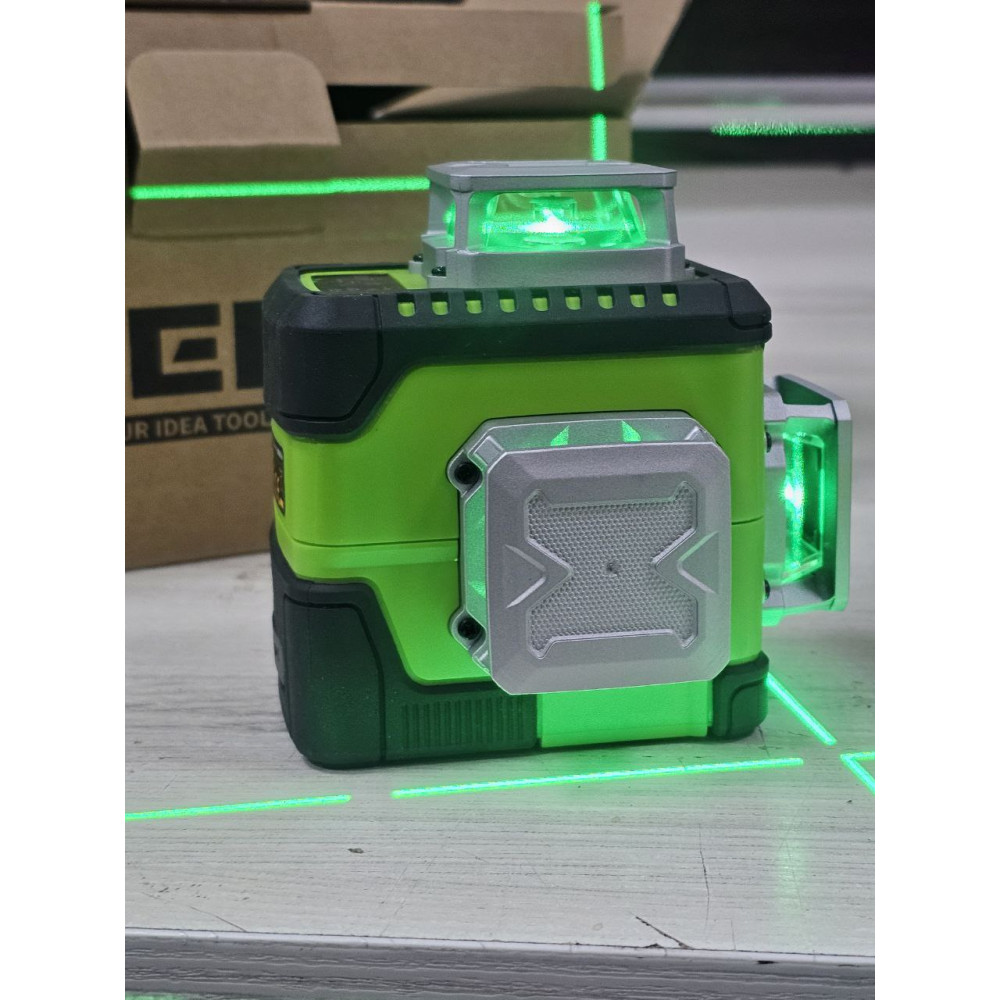 Huepar Y03CG — це професійний 3D лазерний рівень із яскравими зеленими лазерними діодами та точним самовирівнюванням. Інструмент створений для будівельних, монтажних та оздоблювальних робіт, забезпечуючи повне покриття простору, високу точність розмітки та зручний контроль параметрів завдяки вбудованому LCD-дисплею. Рівень формує три лазерні площини по 360° (12 ліній), що дозволяє одночасно працювати зі стінами, підлогою та стелею. Самовирівнювання відбувається всього за кілька секунд, тому прилад швидко готовий до роботи без ручного налаштування. Особливістю моделі є LCD-дисплей, який у реальному часі показує кути нахилу по осях X та Y. Це дозволяє точно контролювати горизонталь і вертикаль, а також виставляти необхідні кути для складних монтажних або будівельних завдань.