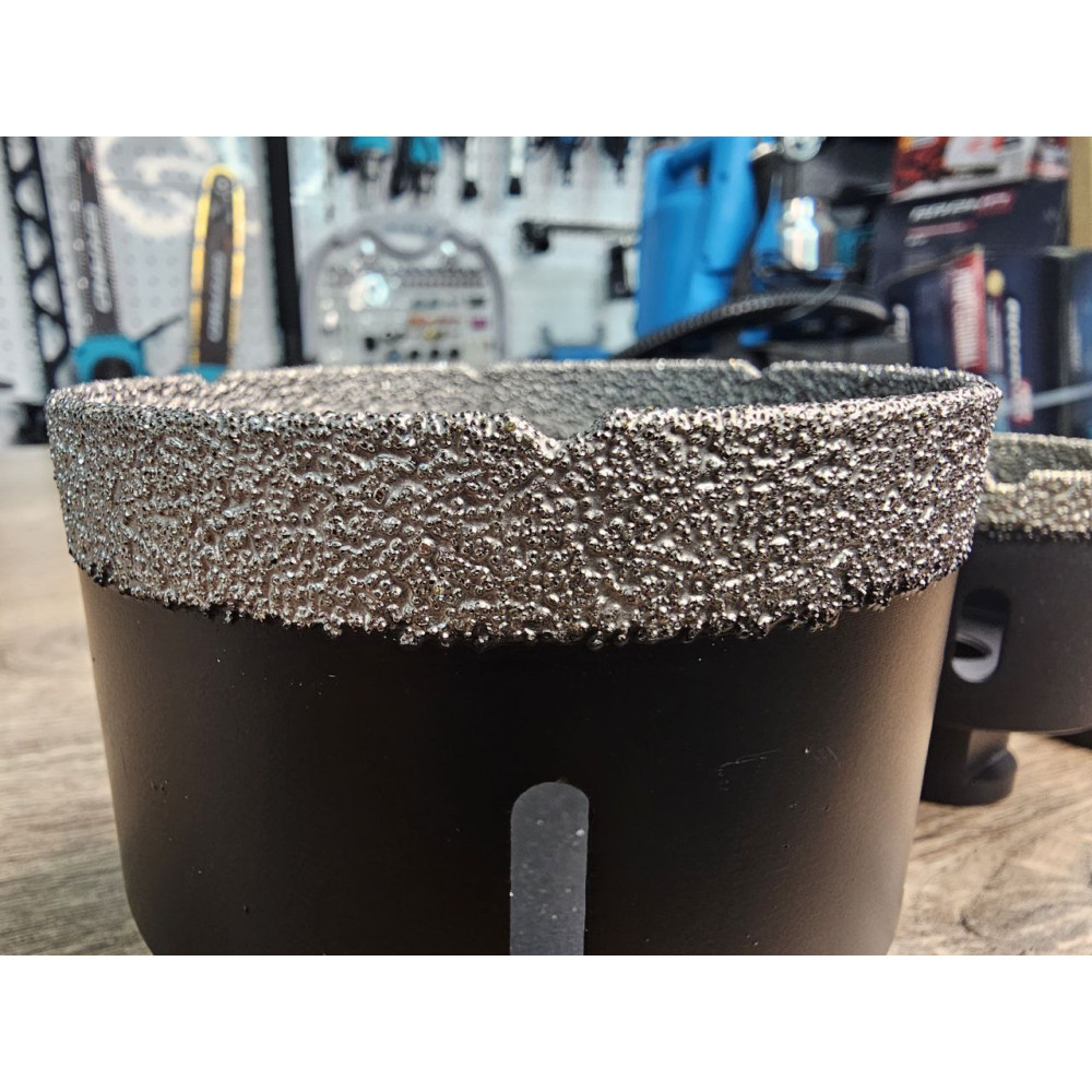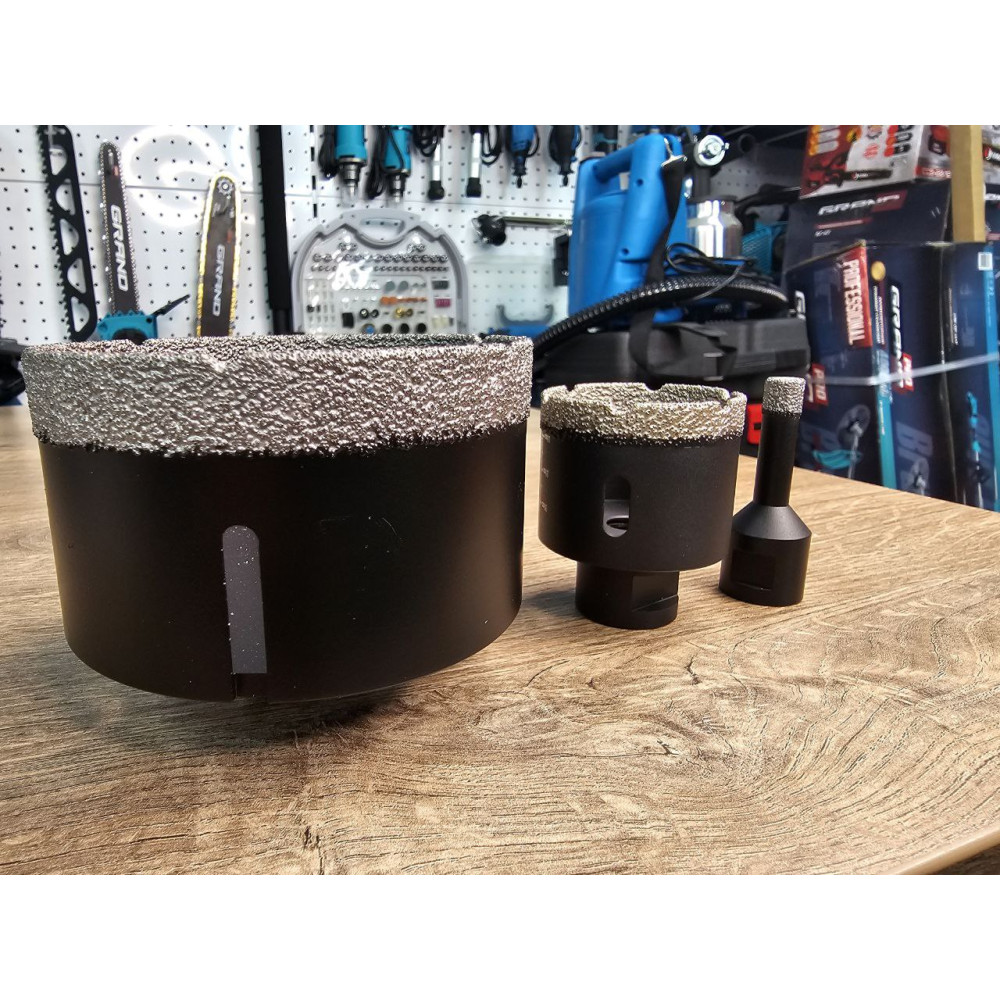 • Для чого потрібні коронки вакуумного спікання? Коронки вакуумного спікання призначені для сухого свердління особливо твердих облицювальних матеріалів, таких як кераміка, керамограніт, мармур, склокераміка. Завдяки алмазному сегменту вони забезпечують точне, чисте та швидке створення отворів без сколів, навіть у найбільш щільних плитках. Використовуються з болгарками (КШМ) із кріпленням M14.