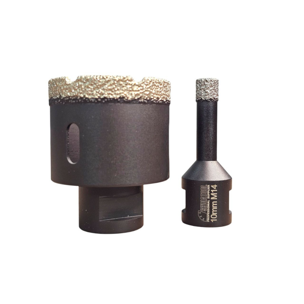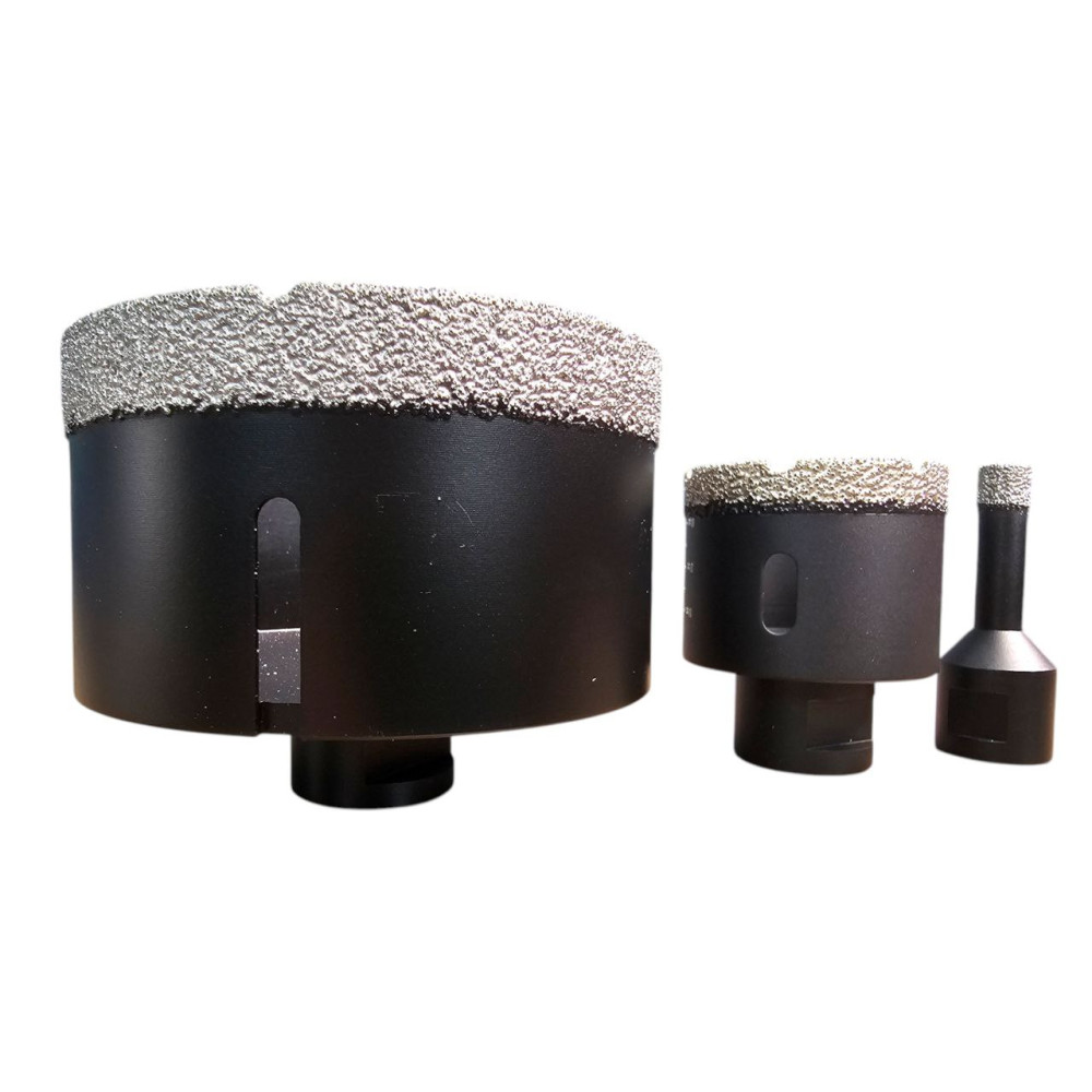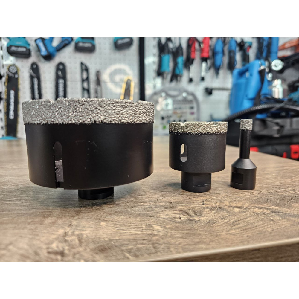 • Для чого потрібні коронки вакуумного спікання? Коронки вакуумного спікання призначені для сухого свердління особливо твердих облицювальних матеріалів, таких як кераміка, керамограніт, мармур, склокераміка. Завдяки алмазному сегменту вони забезпечують точне, чисте та швидке створення отворів без сколів, навіть у найбільш щільних плитках. Використовуються з болгарками (КШМ) із кріпленням M14.